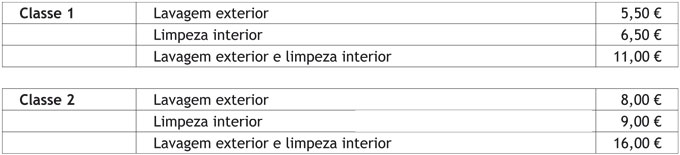 O serviço será cobrado após a sua prestação, em numerário e de acordo com a seguinte tabela de preços (IVA incluído).